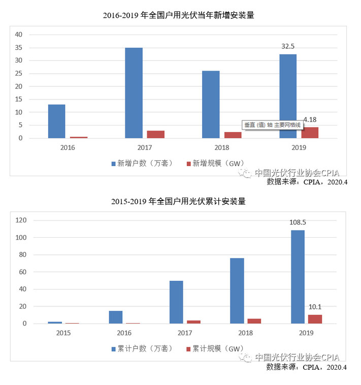 2019年,戶用光伏成為新增裝機(jī)中的亮點(diǎn)。根據(jù)國(guó)家能源局公布的數(shù)據(jù),2019年戶用光伏項(xiàng)目納入規(guī)模管理指標(biāo)中的新增裝機(jī)規(guī)模為5.29GW,其中包含2018年并網(wǎng)但未納入當(dāng)年國(guó)家規(guī)模管理的項(xiàng)目規(guī)模約為1.11GW,2019年實(shí)際新增裝機(jī)規(guī)模為4.18GW,同比增長(zhǎng)74.2%。通過(guò)協(xié)會(huì)的調(diào)研數(shù)據(jù)測(cè)算,截至2019年底,戶用光伏項(xiàng)目累計(jì)裝機(jī)規(guī)模突破10GW,達(dá)到10.1GW;2019年全國(guó)戶用光伏項(xiàng)目新增戶數(shù)約為32.5萬(wàn)套,同比增長(zhǎng)約25%,累計(jì)安裝戶數(shù)超過(guò)百萬(wàn)套,達(dá)到108.5萬(wàn)套。