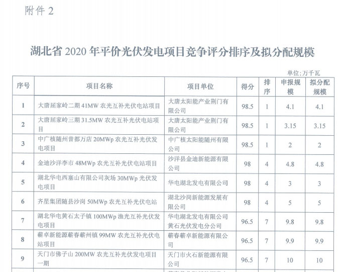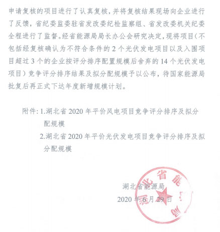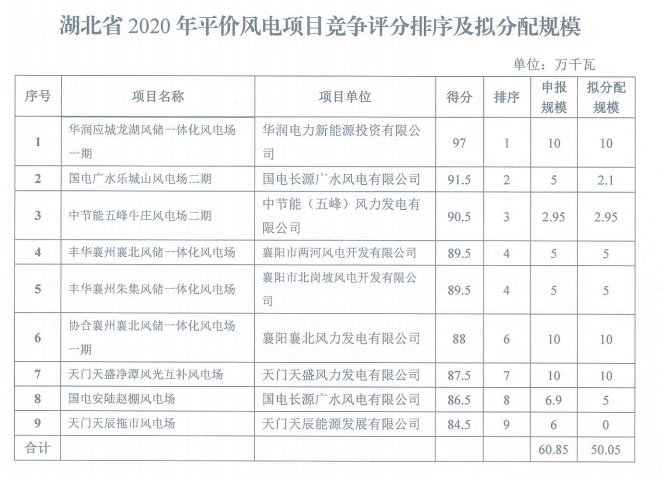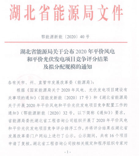 湖北省能源局關(guān)于公布2020年平價風(fēng)電和平價光伏發(fā)電項目競爭評分結(jié)果及擬分配規(guī)模的通知