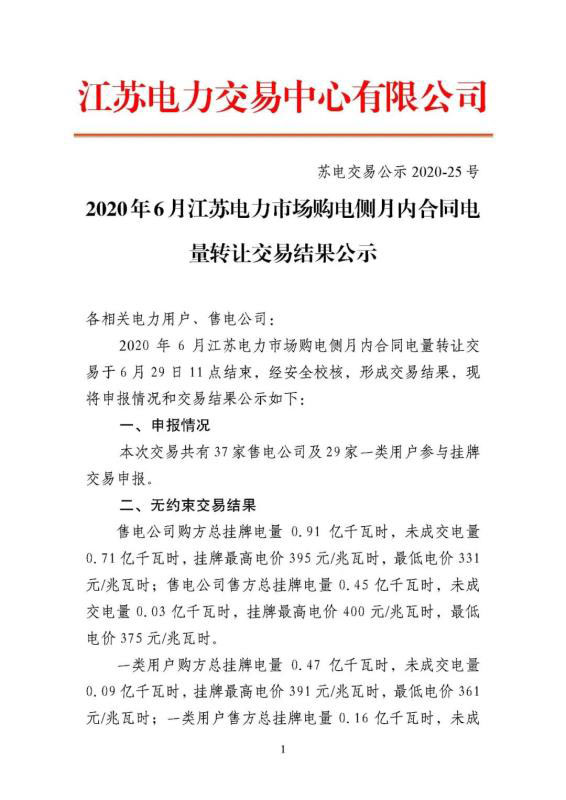 2020年6月江蘇電力市場(chǎng)購電側(cè)月內(nèi)合同電量轉(zhuǎn)讓交易結(jié)果公示