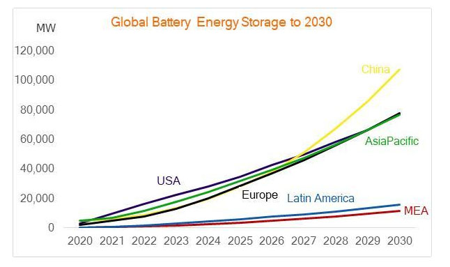 亞太地區(qū)的其他國家,將以韓國、印度和日本為主導(dǎo),歐洲則以德國和英國為首,意大利、西班牙甚至荷蘭和比利時也正在不斷擴(kuò)大儲能裝機(jī)量。屆時將結(jié)束與美國并駕齊驅(qū)的預(yù)測期,爭奪僅次于中國的第二順位排名。拉丁美洲、中東和非洲市場則仍屬小型市場。