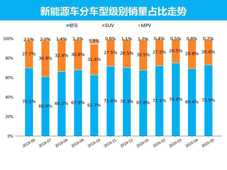 從整體新能源市場(chǎng)銷量情況來(lái)看,2020年5月,新能源車(chē)共銷售了6.0萬(wàn)輛,占整個(gè)市場(chǎng)銷量的3.8%。與上個(gè)月相比,新能源車(chē)銷量環(huán)比增長(zhǎng)24.7%;與去年同期相比,新能源車(chē)銷量同比下跌29.1%,不過(guò)去年6月銷量猛增,是受到了新能源補(bǔ)貼調(diào)整影響。