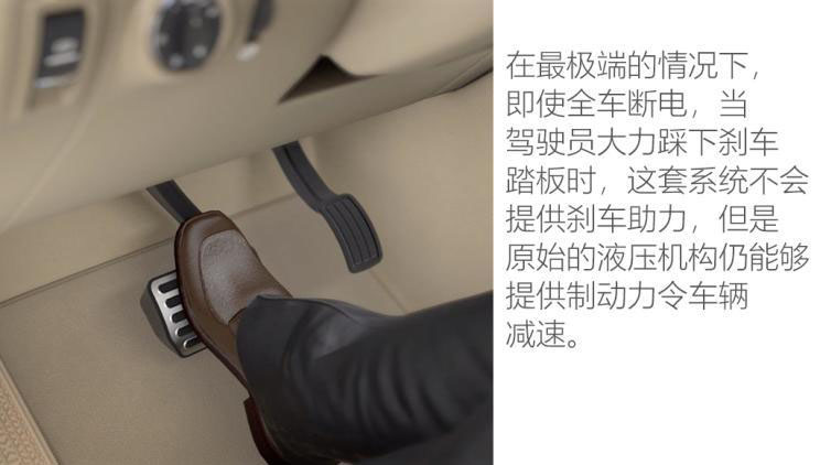 那么這套系統(tǒng)有沒有可能出現(xiàn)失效的情況呢?首先作為車內(nèi)安全性等級最高的零部件之一(ASIL D級),剎車系統(tǒng)擁有極高的可靠性。其次在博世提供的iBooster資料中,提到了這套系統(tǒng)提供了兩道在極端情況下的安全失效模式,在第一種模式中考慮到了兩種極端情況:一種是車載電源系統(tǒng)故障不能滿負載運行,此時iBooster將以節(jié)能模式運行;另一種是iBooster本身出現(xiàn)了故障,這時候車輛的電子穩(wěn)定系統(tǒng)將接替剎車系統(tǒng)發(fā)揮作用,這兩種情況下車輛仍能夠提供0.4g的減速度(大約為普通車型全力剎車力度的40%),但前提是駕駛員大力踩下剎車踏板(至少200牛,約合20千克,大約一個6歲兒童的重量)。