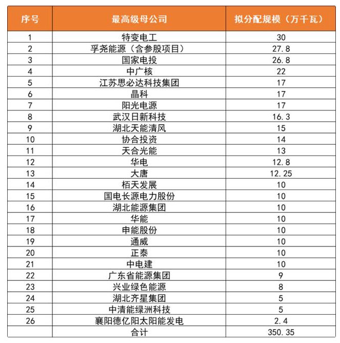 2020年6月30日,湖北省能源局公布2020年平價光伏和平價風(fēng)電發(fā)電項目競爭評分排序結(jié)果及擬分配規(guī)模,擬分配平價光伏項目49個,共計規(guī)模3.5GW;平價風(fēng)電項目9個,共500.5MW。