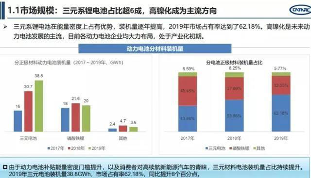 《報(bào)告》顯示:“2019年三元系鋰電池占比超6成,高鎳化成主流方向。由于三元系鋰電池在能量密度上占有優(yōu)勢(shì),裝機(jī)量逐年提高,去年市場(chǎng)占有率達(dá)到了62.18%,高鎳化是未來動(dòng)力電池發(fā)展的主流,目前各動(dòng)力電池企業(yè)均大力布局。”