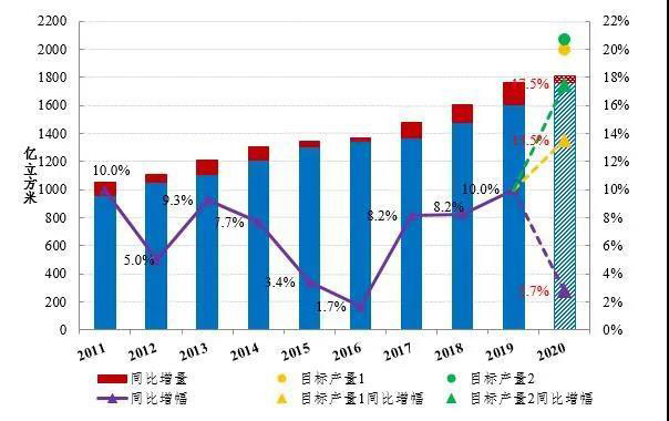 為了擴大清潔能源利用規(guī)模,政府對提高天然氣產(chǎn)能一直抱有較高的期望,但在資源條件、改革進(jìn)程和體制機制等多方面的約束下,實際效果不盡如人意,頁巖氣和煤層氣實際產(chǎn)量屢次未能達(dá)到規(guī)劃目標(biāo)。2016年發(fā)布的《天然氣發(fā)展“十三五”規(guī)劃》提出,2020年天然氣產(chǎn)量預(yù)期目標(biāo)為2070億立方米,2018年9月發(fā)布的《關(guān)于促進(jìn)天然氣協(xié)調(diào)穩(wěn)定發(fā)展的若干意見》提出,2020年產(chǎn)量目標(biāo)2000億立方米以上。若要實現(xiàn)“十三五”產(chǎn)量目標(biāo),意味著2020年產(chǎn)量增長率要達(dá)到17.5%;若要實現(xiàn)2018年提出的2020年產(chǎn)量目標(biāo),增長率也需達(dá)到13.5%(見圖1)。從目前來看,實現(xiàn)這些目標(biāo)都有困難。