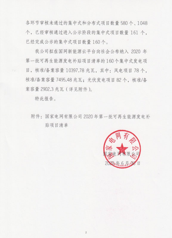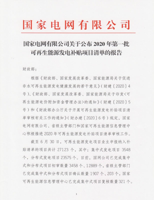 關(guān)于公布2020年第一批可再生能源發(fā)電補貼項目清單的公告