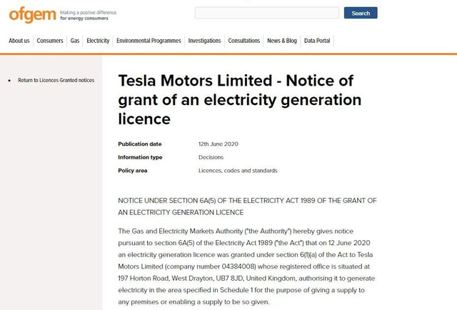 6月12日,英國天然氣與電力市場辦公室根據(jù)《1989年電力法案》第6A(5)條,特此通知,根據(jù)該法案第6(1)(a)條,特斯拉汽車有限公司獲得發(fā)電許可證(公司編號04384008),其注冊辦事處位于英國UB7 8JD區(qū)西德雷頓荷頓路197號,授權(quán)該公司在英國、毗鄰英國的領(lǐng)?;蚩稍偕茉磪^(qū)發(fā)電。