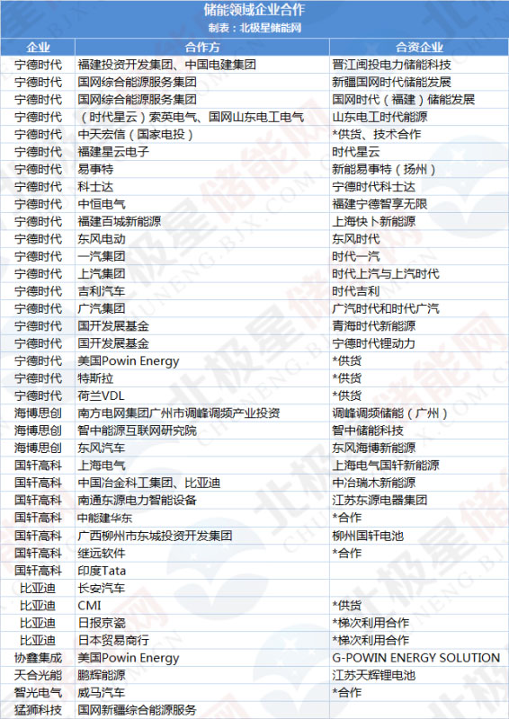 最后還有一種儲(chǔ)能合作,主要發(fā)生在電池企業(yè)和車(chē)企,通過(guò)設(shè)立合資公司生產(chǎn)電池、或進(jìn)行退役電池梯次利用儲(chǔ)能業(yè)務(wù)。還有一些企業(yè)在通過(guò)和新能源汽車(chē)、充電樁等企業(yè)合作布局儲(chǔ)充一體化。