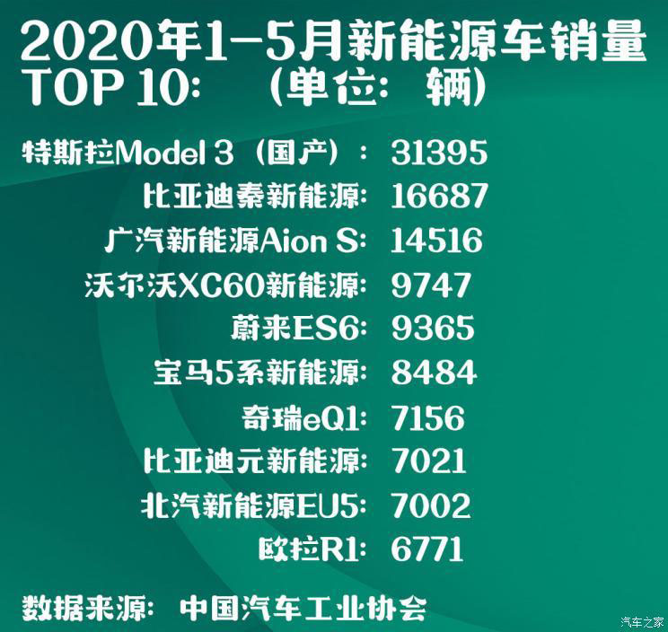 從2020年1-5月新能源車(chē)銷(xiāo)量TOP 10排行榜中我們可以看到,國(guó)產(chǎn)特斯拉Model 3銷(xiāo)量相當(dāng)于第二名比亞迪秦新能源與第三名廣汽新能源Aion S銷(xiāo)量之和,超過(guò)3.1萬(wàn)輛;在插電混合動(dòng)力車(chē)型中,沃爾沃XC60新能源銷(xiāo)量超過(guò)寶馬5系新能源,銷(xiāo)量達(dá)9747輛;雖然微型車(chē)市場(chǎng)在不斷萎縮,但本次榜單依然有奇瑞eQ1和歐拉R1兩臺(tái)小車(chē)上榜,在經(jīng)濟(jì)疲軟情況下,微型車(chē)可能又迎來(lái)一波銷(xiāo)量高峰。下面一起來(lái)看下這10款車(chē)具體的銷(xiāo)量表現(xiàn)。