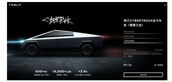 北京時間7月4日消息,據(jù)特斯拉中國官網(wǎng),該公司已經(jīng)在中國開放了電動皮卡Cybertruck的預(yù)訂,訂金為1000元人民幣(約合141美元),較美國的100美元預(yù)訂費用略高。
