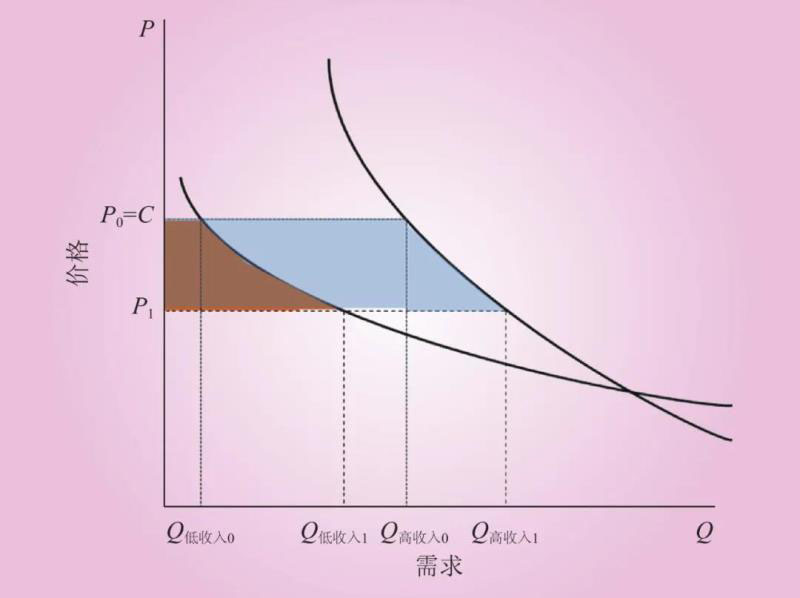 銷售電價交叉補貼是在電力生產(chǎn)者(現(xiàn)實中主要是電網(wǎng)企業(yè))參與下,多個電力消費者之間執(zhí)行電價調(diào)整以達到消費者剩余轉(zhuǎn)移的經(jīng)濟行為。在消費者剩余轉(zhuǎn)移過程中,電力生產(chǎn)者的交易對手是交叉補貼支付方時,生產(chǎn)者剩余將增加;電力生產(chǎn)者的交易對手是交叉補貼接收方時,生產(chǎn)者剩余將減少。但總體而言,銷售側(cè)電價交叉補貼關(guān)系中相互交叉的雙方是不同電力用戶,電力生產(chǎn)者僅具備消費者剩余的“轉(zhuǎn)移通道”功能,因此在單一電價交叉補貼模型下的生產(chǎn)者剩余并不會發(fā)生改變。基于此,我們可以如此設(shè)定電價交叉補貼行為:電力生產(chǎn)者通過漲價獲得的剩余等于降價所損失的剩余。在此假設(shè)下,對電價交叉補貼構(gòu)成影響的僅是電力消費各方自身的特征。