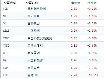 彭博中美股市指數(shù)(CH55BN)中交投最活躍的在美上市的中國(guó)企業(yè)已連續(xù)第四個(gè)星期下跌,這是六個(gè)月以來(lái)下跌周期最長(zhǎng)的一次。全球第二大硅片制造商LDK的股價(jià)跌至歷史最低點(diǎn)。而全球最大的光伏制造商尚德電力的股價(jià)則跌落至七個(gè)月以來(lái)最低水平。