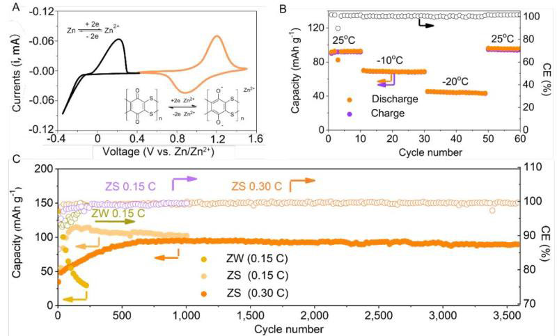 ▲圖5. PDB/Zn電池的電化學(xué)性能。(A)ZS電解質(zhì)的CV曲線(掃速為1 mV s?1)以及組裝的PDB/ZS/Zn電池的CV曲線 (黑色為金屬鋅沉積溶解的曲線,橘黃色為PDB正極的CV曲線,插圖為PDB結(jié)構(gòu)以及反應(yīng)機理)。(B)PDB/ZS/Zn電池在室溫和低溫下的電化學(xué)表征。(C)PDB/Zn電池在ZW(0.15 C)電解質(zhì)以及在ZS電解質(zhì)中(0.15 C和0.30 C)的充放電循環(huán)行為。