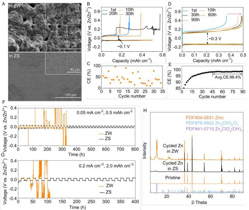 ▲圖2. ZW和ZS電解質(zhì)的金屬鋅的沉積溶解行為。(A)在-0.3 V的條件下,在不銹鋼(SS)上沉積0.5 h后金屬鋅的SEM圖。恒電流條件下(B,C)ZW和(D,E)ZS的庫倫效率(電流密度為0.5 mA cm?2;面容量為0.5 mAh cm?2)。對稱電池分別在(F)0.05 mA cm?2 及(G)0.2 mA cm?2條件下的恒電流充放電曲線。(H)循環(huán)后鋅片的XRD表征。