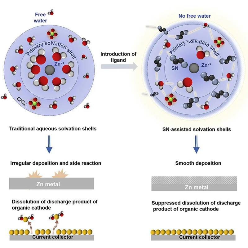 由于熱力學(xué)不穩(wěn)定,鋅負(fù)極與傳統(tǒng)水溶液之間存在固有的副反應(yīng),難以實現(xiàn)可逆的沉積/溶解行為。此外,有機正極反應(yīng)產(chǎn)物極易溶于水也限制了其在水系二次電池中的應(yīng)用。如何設(shè)計水系鋅電解液的組分和結(jié)構(gòu)成為關(guān)鍵。鑒于此,作者提出了一種配體定位的水合熔鹽電解質(zhì)來解決上述問題。具體做法是通過將中性配體丁二腈和六水合高氯酸鋅簡單混合,在沒有外加水的情況下,便可形成水合度精確的室溫共熔液體。其中,配體和水分子全部直接參與到共熔相互作用網(wǎng)絡(luò)中,改變了水合鋅離子的溶劑化結(jié)構(gòu),降低了水分子活性,有效保障了鋅-有機電池的長循環(huán)穩(wěn)定性。