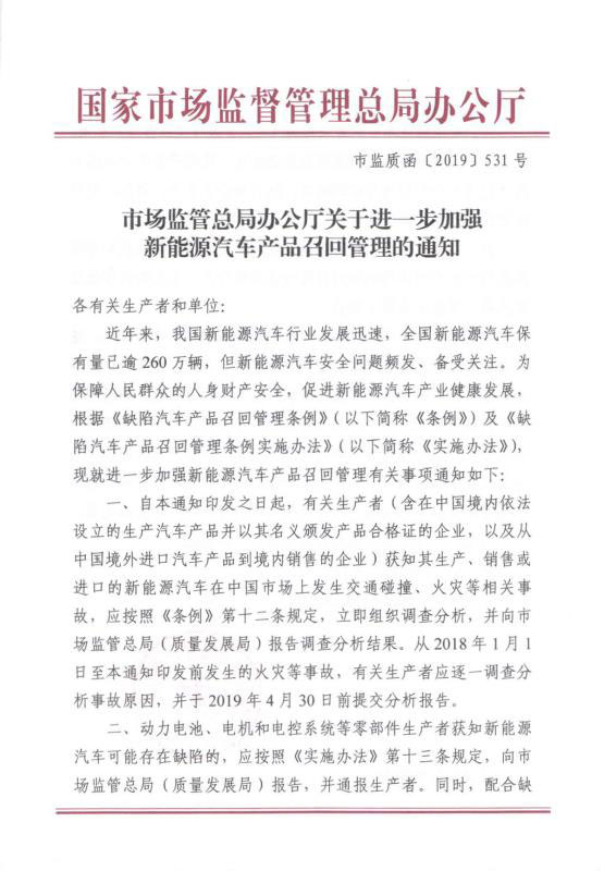 在該通知中明確指出:“動力電池、電機(jī)和電控系統(tǒng)等零部件生產(chǎn)者獲知新能源汽車可能存在缺陷的,應(yīng)按照《缺陷汽車產(chǎn)品召回管理?xiàng)l例實(shí)施辦法》第十三條規(guī)定,向市場監(jiān)管總局(質(zhì)量發(fā)展局)報(bào)告,并通報(bào)生產(chǎn)者。同時(shí),配合缺陷調(diào)查、召回實(shí)施等相關(guān)工作。新能源汽車生產(chǎn)者應(yīng)按照要求,建立健全新能源汽車可追溯信息管理制度,落實(shí)產(chǎn)品安全主體責(zé)任。經(jīng)調(diào)查分析發(fā)現(xiàn)存在缺陷的,應(yīng)立即停止生產(chǎn)、銷售、進(jìn)口缺陷汽車產(chǎn)品,并實(shí)施召回?!?