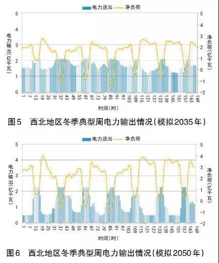跨區(qū)互聯(lián)電網(wǎng)運(yùn)行方式將更加靈活、有力支撐清潔能源高效配置。與調(diào)節(jié)電源、儲(chǔ)能等相比,互聯(lián)電網(wǎng)雖然本身不生產(chǎn)和消耗電力,無法直接參與供需平衡,但通過在空間維度實(shí)現(xiàn)互聯(lián)互濟(jì),有效挖掘并利用不同區(qū)域間的凈負(fù)荷時(shí)序互補(bǔ)特性,可產(chǎn)生與其他靈活性調(diào)節(jié)資源類似的效果。在高比例新能源電力系統(tǒng)運(yùn)行中,各通道輸電功率可隨各區(qū)域新能源可調(diào)出力與負(fù)荷需求等因素進(jìn)行逐時(shí)調(diào)整變化,通過合理安排跨區(qū)域電力配置方案,可有效降低各區(qū)域凈負(fù)荷波動(dòng)。以2035年和2050年冬季典型周生產(chǎn)模擬結(jié)果為例,午間時(shí)段西北地區(qū)光伏大發(fā)而負(fù)荷需求有限,電網(wǎng)通過提高電力外送水平,與各類可控電源一起參與系統(tǒng)調(diào)節(jié),平抑凈負(fù)荷曲線波動(dòng)。其中,2050年由于新能源裝機(jī)規(guī)模更大,凈負(fù)荷波動(dòng)程度更強(qiáng),此時(shí)電網(wǎng)輸電功率逐時(shí)變化程度更高,為系統(tǒng)調(diào)峰和新能源消納作出更大貢獻(xiàn)(見圖5、圖6)。