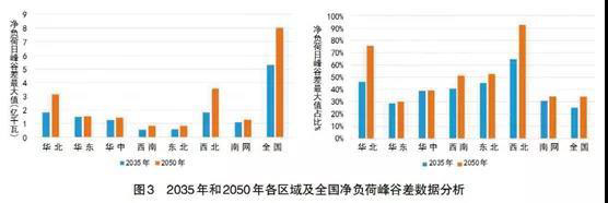 分區(qū)域來看,西北地區(qū)和華北地區(qū)的電力系統(tǒng)靈活性需求量和需求比例最高,對(duì)系統(tǒng)靈活調(diào)節(jié)能力提出了較高要求。2035年,西北地區(qū)日負(fù)荷峰谷差最大值約為1.8億千瓦,占西北地區(qū)最大負(fù)荷的64.8%,華北地區(qū)日負(fù)荷峰谷差最大值約為1.8億千瓦,占華北地區(qū)最大負(fù)荷的46.2%,而到2050年,西北地區(qū)日負(fù)荷峰谷差最大值達(dá)到約3.6億千瓦,占西北地區(qū)最大負(fù)荷的92.9%,華北地區(qū)日負(fù)荷峰谷差最大值約4.1億千瓦,占西北地區(qū)最大負(fù)荷的75.8%,系統(tǒng)靈活調(diào)節(jié)能力亟需改善(見圖3)。