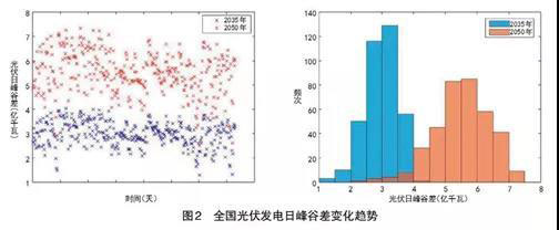 隨著間歇性可再生能源的裝機(jī)規(guī)模不斷擴(kuò)大,風(fēng)電和光伏出力波動(dòng)范圍日益變大。以日峰谷差為例,風(fēng)電出力日峰谷差冬季和春季較大,夏季和秋季相對(duì)較小。2035年全國風(fēng)電功率日峰谷差最大值約為1.9億千瓦,中位數(shù)約為0.9億千瓦;2050年全國風(fēng)電日峰谷差最大值約為3.0億千瓦,中位數(shù)約為1.3億千瓦。光伏出力日峰谷差春季和秋季出力最大,夏季次之,冬季出力最小。2035年全國光伏功率日峰谷差約為4.0億千瓦,中位數(shù)約為3.0億千瓦;2050年全國光伏日峰谷差最大值約為7.3億千瓦,中位數(shù)約為5.5億千瓦(見圖1、圖2)。