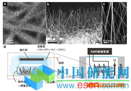 在碳纖維上生長(zhǎng)的硅納米線的SEM照片。(a)為平面照片,(b)為截面照片,(c)為(b)的放大圖。(d)為基于硅納米線電極的鋰離子電池及核磁共振檢測(cè)器的實(shí)驗(yàn)概念圖。