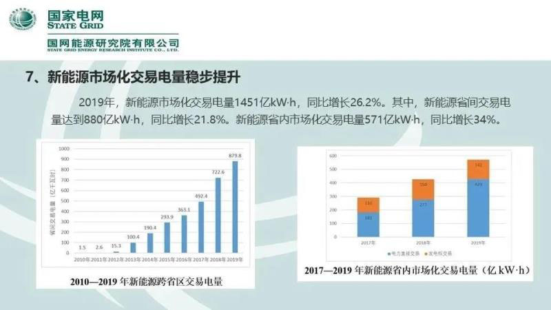 同時,新能源市場交易電量也得到了穩(wěn)步提升。2019年,新能源市場化交易電量1451億kW·h,同比增長26.2%。其中,新能源省間交易電量達到880億kW·h,同比增長21.8%。新能源省內(nèi)市場化交易電量571億kW·h,同比增長34%。