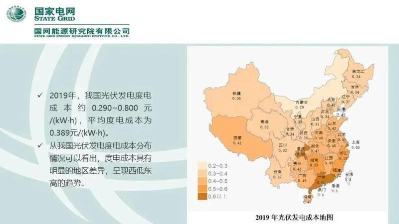 《報告》中指出,我國風電、光伏發(fā)電成本進一步下降,2019年國內(nèi)光伏發(fā)電度電成本約0.290-0.800元/(kW·h),平均度電成本為0.389元/(kW·h)。從我國光伏發(fā)電度電成本分布情況可以看出,度電成本具有明顯的地區(qū)差異,呈現(xiàn)西低東高的趨勢。