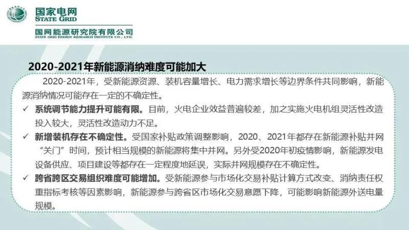 2020-2021年,受新能源資源、裝機容量增長、電力需求增長等邊界條件共同影響,新能源消納情況可能存在一定的不確定性,諸如系統(tǒng)調(diào)節(jié)能力提升可能有限、新增裝機存在不確定性、跨省跨區(qū)交易組織難度可能增加。