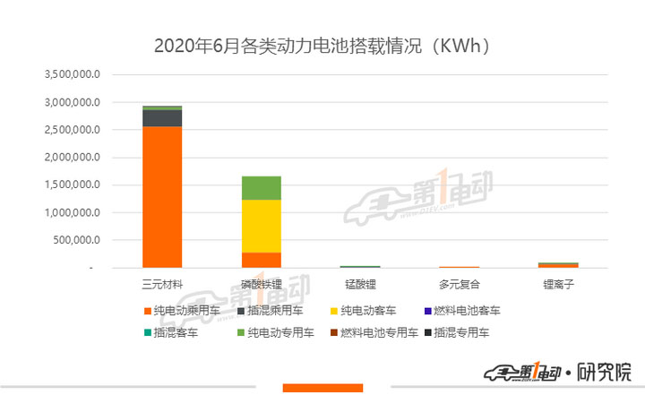 6月三元材料的搭載量為2.92GWh,環(huán)比增長10.6%。其中乘用車占比98.2%,三元材料搭載量占總搭載量的62.1%,較上月下滑了約13個(gè)百分點(diǎn)。磷酸鐵鋰電池6月總搭載量為1.66GWh,環(huán)比大漲108.1%,在月度裝機(jī)中的占比也提升至35.4%。磷酸鐵鋰電池在乘用車、客車和專用車領(lǐng)域的裝機(jī)量環(huán)比分別上漲了143.0%、109.8%和86.0%。