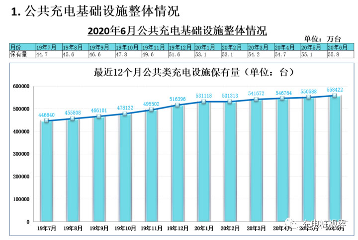 數(shù)據(jù)顯示,截至2020年6月,聯(lián)盟內(nèi)成員單位總計上報公共類充電樁55.8萬臺,其中交流充電樁32.4萬臺、直流充電樁23.4萬臺、交直流一體充電樁488臺。