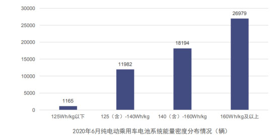 2020年6月,我國(guó)純電動(dòng)乘用車系統(tǒng)能量密度在160Wh/kg及以上車型產(chǎn)量占比明顯提升,達(dá)46.3%,較5月份提升15.0%;125(含)-140Wh/kg和140(含)-160Wh/kg車型產(chǎn)量占比分別為20.5%和31.2%;125Wh/kg以下車型占比2.0%,較5月稍有增長(zhǎng)。