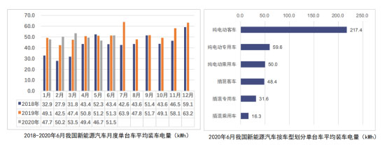 2020年6月,我國(guó)新能源汽車按車型劃分的平均裝車電量51.5kWh,環(huán)比上升