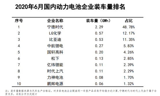 2020年6月,我國(guó)新能源汽車市場(chǎng)共計(jì)48家動(dòng)力電池企業(yè)實(shí)現(xiàn)裝車配套,較5月份增加6 家,其中排名前10的動(dòng)力電池企業(yè)分別是寧德時(shí)代、LG化學(xué)、比亞迪、中航鋰電、國(guó)軒高科、松下、億緯鋰能、時(shí)代上汽、力神電池、鵬輝電源。