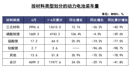 2020年6月,我國(guó)動(dòng)力電池裝車量為4.7GWh,同比下降29.1%,環(huán)比增長(zhǎng)34.0%。其中,三元電池共計(jì)裝車3.0GWh,同比下降36.2%,環(huán)比上升12.1%;磷酸鐵鋰電池共計(jì)裝車1.7GWh,同比下降4.0%,環(huán)比增長(zhǎng)106.4%。