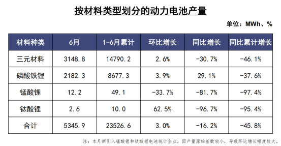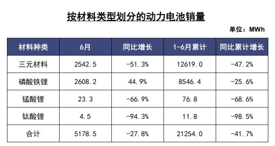 2020年6月,我國(guó)動(dòng)力電池銷量共計(jì)為5.2GWh,同比下降27.8%。其中,三元電池銷售為2.5GWh,同比下降51.3%,占總銷量59.4%;磷酸鐵鋰電池銷售為2.6GWh,同比增長(zhǎng)44.9%,占總銷量40.2%。