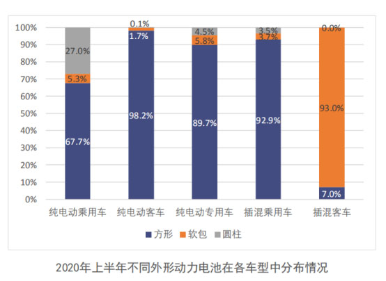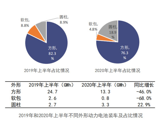 從電池類型來(lái)看,2020年上半年,國(guó)內(nèi)新能源汽車市場(chǎng)仍以方形動(dòng)力電池為主,共計(jì)裝車13.3GWh,占比76.3%,較2019年上半年下降了6%。此外,受特斯拉model3車型產(chǎn)量帶動(dòng),圓柱電池裝車占比較去年同期提升了10%;另外,軟包電池實(shí)現(xiàn)裝機(jī)量約0.26 GWh,環(huán)比增長(zhǎng)24%,占總體的5%,整體勢(shì)力較弱。