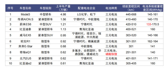 根據(jù)中國(guó)汽車工業(yè)協(xié)會(huì)發(fā)布數(shù)據(jù),2020年上半年,我國(guó)產(chǎn)量排名前十的純電動(dòng)乘用車有特斯拉、蔚來(lái)、比亞迪、威馬、奇瑞、北汽等企業(yè)車型,所用動(dòng)力電池主要以三元電池為主,除蔚來(lái)ES6外,電池系統(tǒng)能量密度在140Wh/kg以上。