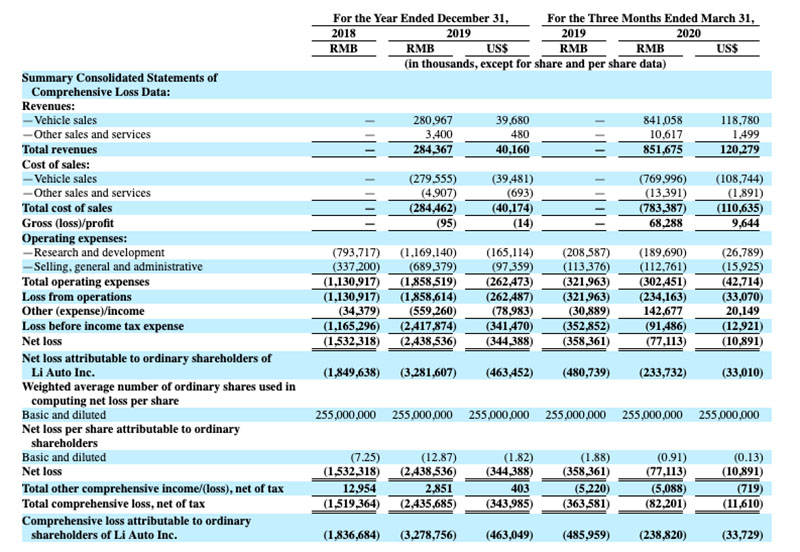 除此之外,IPO文件還透露了理想汽車自2018年至今的經(jīng)營(yíng)狀況。理想汽車從2019年開始錄得收入。同時(shí),得益于首款車型理想ONE的下線交付,2020年1月~3月,該公司毛利潤(rùn)轉(zhuǎn)正。