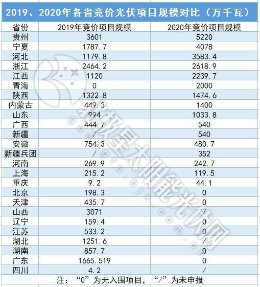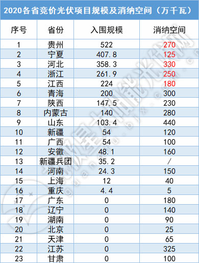 從最終入圍名單來看,26GW的總容量也超過2019年的22.8GW。其中最大規(guī)模為貴州省的5.2GW,此外規(guī)模超過2GW(包括)的省份由2019年的2個增加到2020年的6個,包括貴州、寧夏、河北、浙江、江西、青海。