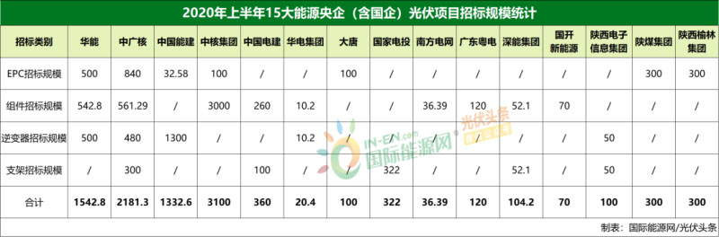 經(jīng)國際能源網(wǎng)/光伏頭條根據(jù)公開資料不完全統(tǒng)計,2020年上半年國家電投、中廣核、華能、中核集團(tuán)、中能建、中電建、大唐等15大能源央企(含國企)共啟動了近36GW規(guī)模的光伏項目(含設(shè)備采購)招標(biāo)工作,截止目前已完成近10GW項目的中標(biāo)公示工作。