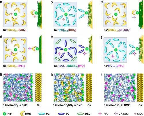 圖4. 描述電解質(zhì)鈉陽極界面的陰離子界面模型。采用不同金屬鹽的1.0 M二甲醚電解質(zhì)模型
