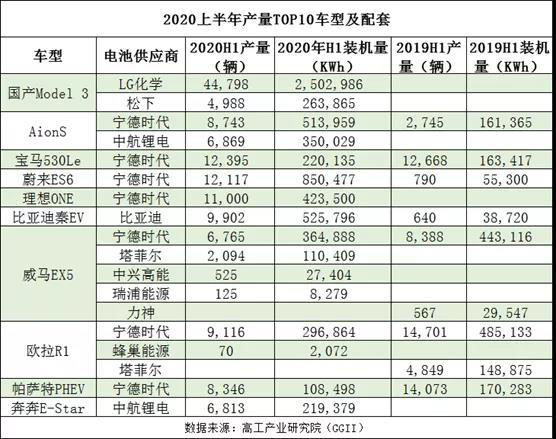 GGII數(shù)據(jù)顯示,上半年國內(nèi)產(chǎn)量新能源乘用車TOP 10車型累計(jì)生產(chǎn)了14.47萬輛,累計(jì)裝機(jī)電量6.79GWh。