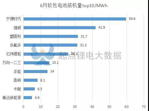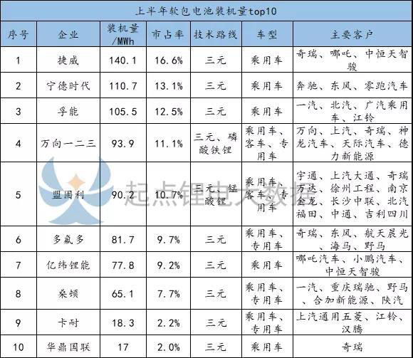 據(jù)起點鋰電大數(shù)據(jù)統(tǒng)計,上半年實現(xiàn)軟包電池裝機的企業(yè)共有23家,排名前十的企業(yè)分別是捷威、寧德時代、孚能、萬向一二三、盟固利、多氟多、億緯鋰能、桑頓、卡耐和華鼎國聯(lián),10家企業(yè)合計裝機量合計占比95%。