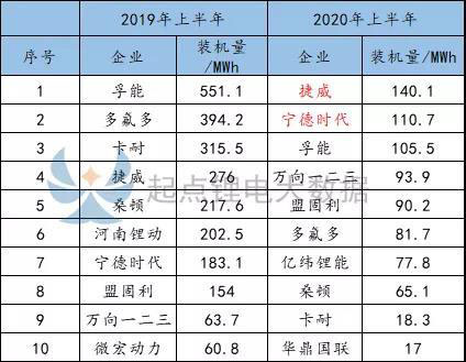與去年同期相比,top10企業(yè)排名變動較大,孚能、多氟多、卡耐、捷威、桑頓、寧德時代、盟固利、萬向一二三8家企業(yè)還在榜單,河南鋰動、微宏動力則掉出前十,億緯鋰能、華鼎國聯(lián)新進(jìn)入前十。