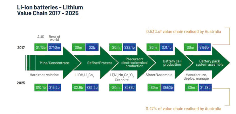 根據(jù)評(píng)估結(jié)果,盡管澳大利亞已經(jīng)占據(jù)了電池生產(chǎn)原料供應(yīng)市場(chǎng)的很大一部分,但澳大利亞卻錯(cuò)失了包括材料提煉在內(nèi)的下游加工以及電池生產(chǎn)和組裝等更大的市場(chǎng)機(jī)會(huì)。