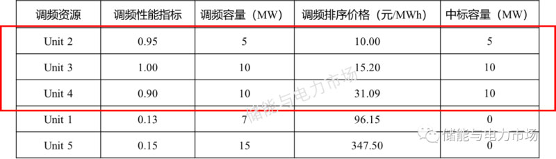 排序價格確定后,根據(jù)市場調頻需量確定邊際機組。如市場需量為25MW,則下圖中邊際機組為unit4。