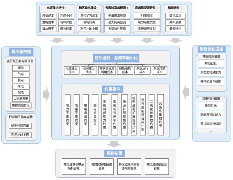 國(guó)網(wǎng)能源院能源互聯(lián)網(wǎng)研究所構(gòu)建了電力系統(tǒng)源-網(wǎng)-荷-儲(chǔ)協(xié)調(diào)規(guī)劃模型,自主開(kāi)發(fā)了程序代碼,能夠?qū)σ?guī)劃期內(nèi)中國(guó)各區(qū)域各類電源、輸電通道、需求側(cè)資源、儲(chǔ)能等電力系統(tǒng)各個(gè)部分進(jìn)行統(tǒng)籌規(guī)劃,得到電力系統(tǒng)整體最優(yōu)發(fā)展路徑。求解方式為通過(guò)建立數(shù)學(xué)優(yōu)化模型,將規(guī)劃期內(nèi)各年份各區(qū)域各類源網(wǎng)荷儲(chǔ)元素的發(fā)展規(guī)模設(shè)為待求解變量,構(gòu)建目標(biāo)函數(shù)與約束條件,通過(guò)計(jì)算機(jī)編程的方式,求得一組滿足各項(xiàng)約束條件、且使得目標(biāo)函數(shù)值最小的解。