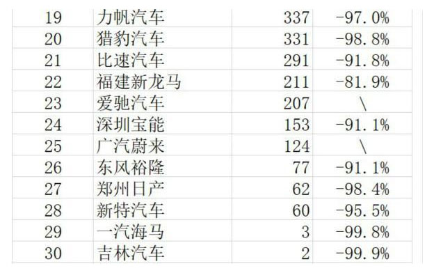 還有不少上榜的車企是新能源車企,比如江鈴新能源、云度汽車、愛馳汽車、新特汽車、知豆汽車、康迪汽車、電咖汽車等,其中,知豆汽車、康迪汽車、電咖汽車上半年銷量為零,幾乎已經(jīng)處于停產(chǎn)的階段。