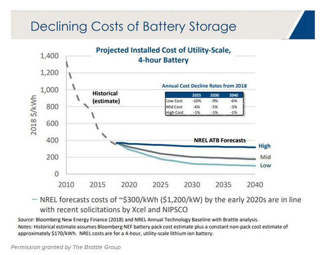 Brattle爾集團(tuán)于5月13日在麻省理工學(xué)院的一次研討會(huì)上發(fā)表的一份演講報(bào)告指出,鋰離子電池儲(chǔ)能系統(tǒng)的成本下降得如此之快,以至于現(xiàn)在對(duì)于其他儲(chǔ)能技術(shù)來(lái)說(shuō)無(wú)法在提供可靠性和電網(wǎng)服務(wù)方面與其展開(kāi)競(jìng)爭(zhēng)。Brattle的報(bào)告聲稱,電池儲(chǔ)能系統(tǒng)的價(jià)格從2010年的1400美元/kWh降至400美元/kWh以下,到2040年可能降到200美元/kWh或更低。