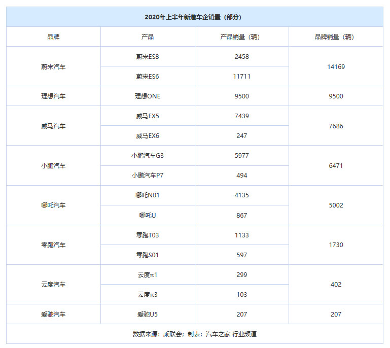 上述幾家企業(yè)都是2020年上半年新勢力車企中銷量“尖子生”。根據乘聯(lián)會最新的統(tǒng)計數(shù)據,2020年上半年,中國品牌造車新勢力銷量排名前五的品牌分別為蔚來汽車、理想汽車、威馬汽車、哪吒汽車和小鵬汽車,它們累計銷量為42828輛,占比中國品牌造車新勢力總銷量的91%、全國新能源總銷量的13.1%。造車新勢力在國內新能源圈已占有一席之地,且兩級分化現(xiàn)象明顯。