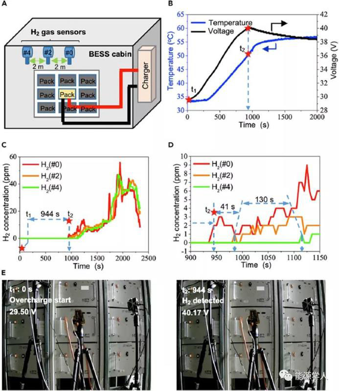 圖5 鋰電池組(9個電池組,79.2 kWh)的安全警告實驗。(a)真實BESS艙內的實驗環(huán)境示意圖,三個H2氣體傳感器設置在不同的距離。(B)LiFePO4電池組在過充過程中的電壓分布和表面溫度變化。(C)三個傳感器0–2500 s的H2氣體濃度變化曲線;(D)三個傳感器放大的H2氣體濃度變化曲線900–1150s;(E)初始時間t1=0s和t2=994s時的光學圖像。